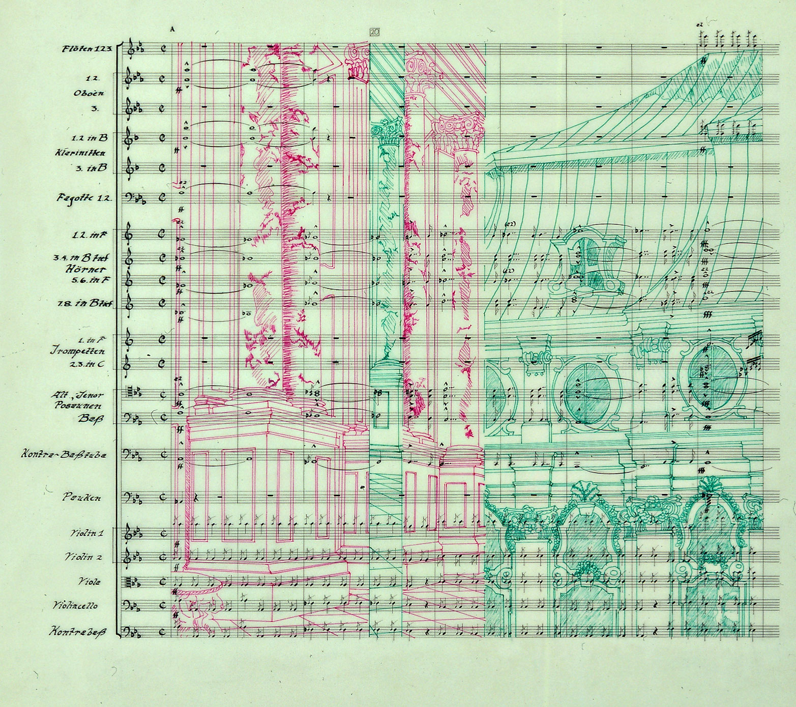 Hand copied music,measures 17-25 of Finale with St. Florian's Marble inside and outside (C) Jack Ox 1989
