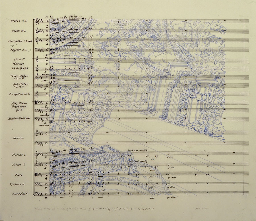 Hand copied music,measures 34-38 of Adagio with St. Florian's Church inside (C) Jack Ox 1987