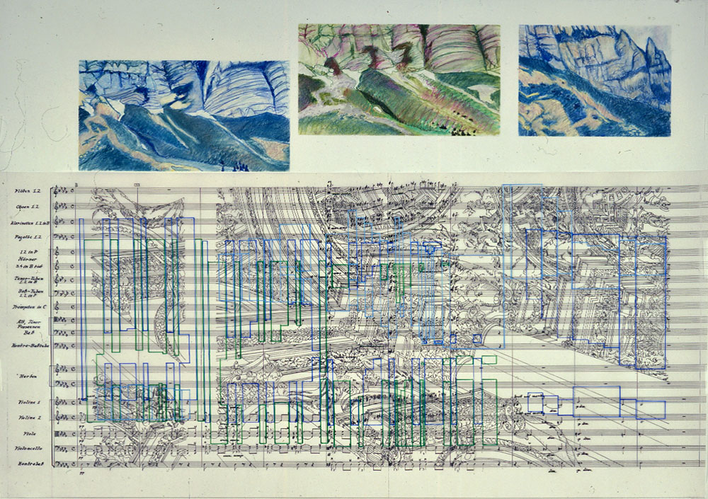Measures 129-38 of Adagio, St. Florian's image, Alpine images, and fracturing Scheme (C) Jack Ox 1987