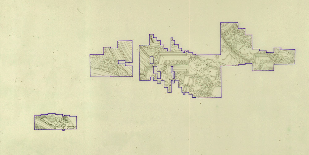 This drawing shows exactly which parts of the original architectural drawing has become part of the painting, (C) Jack Ox 1987