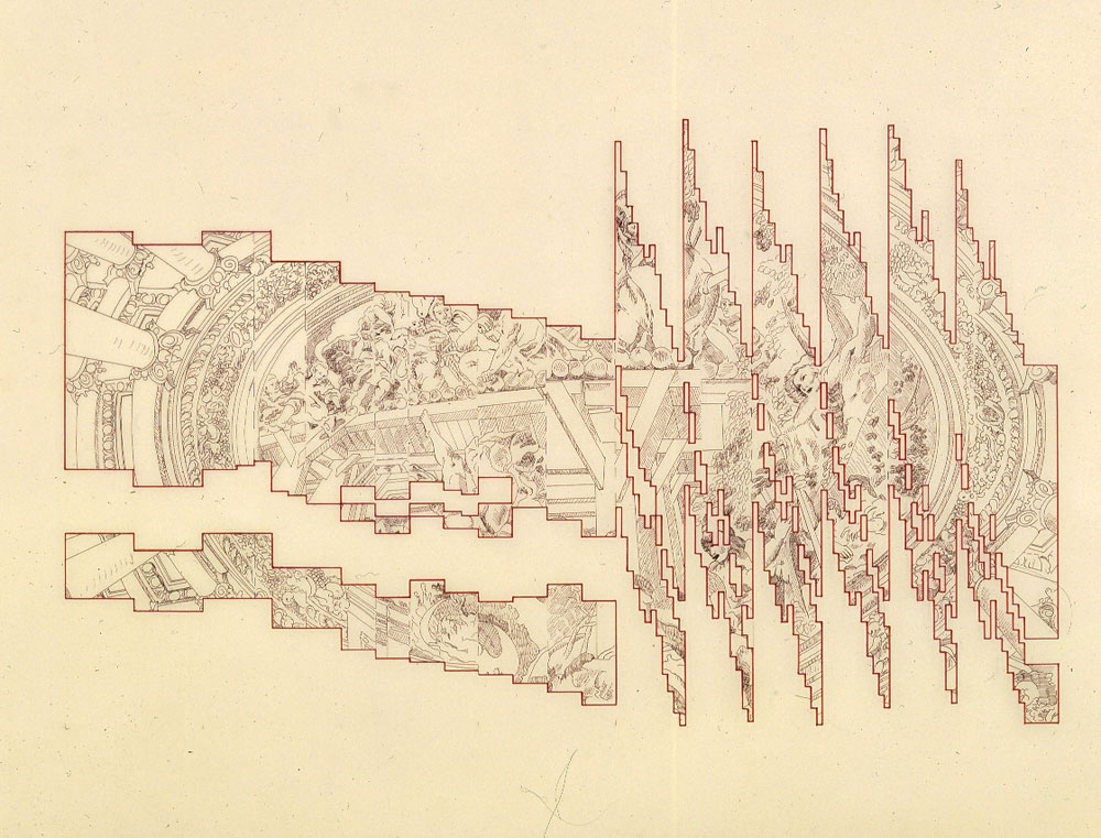 This drawing shows exactly which parts of the original architectural drawing has become part of the painting, (C) Jack Ox 1988