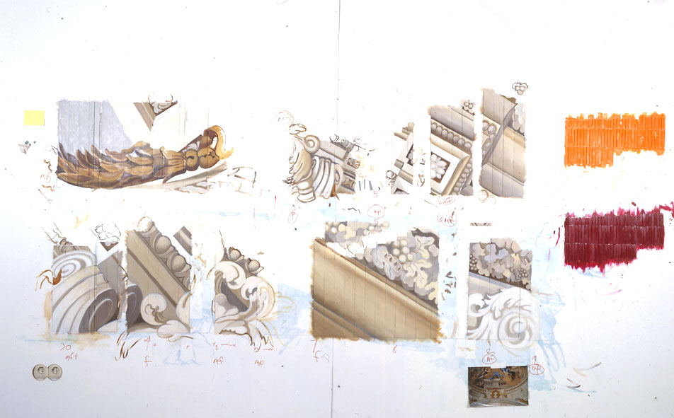 Actual painted fiberglass strips of the final painting photograped on the was prior to restructuring (C) Jack Ox 1989