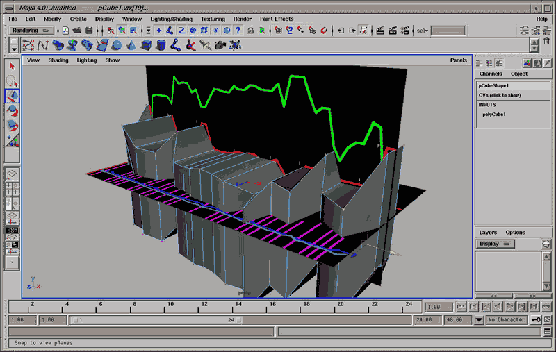 When we came to AHPCC we had a two-fold purpose: 1. Jack Ox, the artist half of our collaboration, needed to work out a process for modeling into 3d objects the information (pitch and loudness) derived from 180 different sound files supplied by Alvin Curran, the composer who is organizing the music of our future Gridjam, and 2. We wanted to experiment with sending these files to Boston on the AccessGrid. The technical support which I was provided was excellent. Chris Davis, our assigned graduate student, was able to understand what I needed and actually taught me to do it myself in Maya. I have been empowered in an incredibly significant way during the residency. And we have determined that because we must make some money back on this project, we cannot utilize student workers on Maya. As I am now prepared to accomplish the entire task with my own hands is very important, and the best solution for the problem. It is actually a good thing for the work when I embark on large and repetitive tasks. I believe that technology should be combined with hand work, i.e. the hand drawn texture maps laboriously produced with pencil and paper over orthographic views of landscape models. Now, during the long process of making 180 models the subtleties of difference and sameness in the sounds and their models will become defined in this visual language as I think with my hands. Unfortunately, the attempt on the AccessGrid was not so successful because programming was not prepared in time so that we were able to send the new objects during our AccessGrid time slot.. We could have achieved this, except that the connection between the Viz Lab and the AG rooms were cut when everything else was working. Tom Caudell said thats research and I expect he is right. Below you can see a model of the sound made by bison. The green line maps the changes in dynmamics (loud/soft) and the red line maps pitch changes. The model is scaled smaller for soft and wider for loud. It is then shifted up and down from the other direction to reflect pitch changes. |
