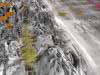 | All of the 3d models of landscapes have and are being done by Richard Rodriguez at Absolute Reality Corp. (We have completed 5 out of 8 total landscapes at this time.) All of the texture maps are in my hand. What we discovered in this process is that I needed to draw all textures outside of the computer environment. In each instance Rodriguez would create a flat version of the wire frame which I would print out in a large, tiled version and make the texture map in a large scale on my drawing table with real pencil. The different landscape formations required different techniques, which I will describe. I found that it was better to cut up the original texture drawing and scan it in directly in order to keep a high resolution. All landscapes are units in a world where they can be mirrored together infinitely, or as many times as needed to accommodate a specific piece of music. Creating the texture map automatically by computer from the original drawing would not have been possible, since each drawing is a two dimensional view from a single perspective. The model for Strings was definitely the most complex piece, and also the one which is the largest landscape. Because it is a real place we were able to begin with a topological map of Fonts Point and make an accurate drawing of the 3 washes which are the basis for the land formations. Rodriguez used Animi Tek WorldBuilder 1.0 to build it initially, but because the 3D geometry was far too large at 500,000 polygons. He then created a height map from it, applied this as a displacement for a lower resolution geometry, which came in at 4,000 polygons. It is made from 24 equal parts (8x4), each one having a resolution of 1024 x 1024. The final version was done in 3D Studio Max 2.5 Our aim for the CAVE environment is to have a very low poly count with a high resolution texture map. In order for me to make an orthographic texture map which would cover all surfaces of the model, Rodriguez gave me screen shots of the model from 4 different angles of view. The last view was straight overhead, and this one I tiled and printed out to fit my drawing table, put tracing paper over it and drew all of the water carved desert hill textures. Sandpaper texture has become a ground cover for everything without another specific texture. It mirrors itself on all 4 sides so that it can be repeated seamlessly and was only modeled on a bump map, the rocks being portrayed are so close to the ground it is useless to make actual objects out of them. Where sandpaper runs into other textures Elastic Reality was used to make the blending gradient.. Because the Vocals landscape exists on the ends of the VR space their modeling is modified. The original drawing was cut out, points were placed on these sections and pushed in and out, representing spatial points in the original rock structure. This allows for a very low polygon count, always a goal when working in a real time VR situation like the CAVE. Caligari trueSpace 4.2 was used for both Vocal and Woodwinds because it permits polygons that are larger than 3 points, a feature not common to all 3D programs and one which supports low polygon numbers. Some of the rocks towers in Woodwinds were modeled by themselves out of cylinders, unwrapped into flat versions of the wire frames and sent to me. I printed out 12-15 inch high frames, over which I made an unwrapped texture map on my drawing table, scanned it back in to the computer, where it was wrapped around the model. Rock groups were made into planar models, mirrored on the backside and with a modified modeling as in the vocals. In all of the musical visualizations that I have made during the last 20 years there has been a very close relationship between the images, through which the structure of the music is viewed, and the music itself. My work has always used landscape and/or architectural images which related structurally, chronologically, or in the case with my visual performance of Kurt Schwitters' Ursonate, with the large scale installation art works of Schwitters himself. In the case of Mizelle's music, he had created his composition using the text of Chardin's poem. Therefore I to went to Hymn to Matter for direction in creating a meaningful context in which to perform Quanta and Hymn to Matter. It turns out that this is a far more flexible world, containing elements which directly connect to other music, by other composers. I decided to keep all of the landscapes in gray scale so that the only color you see takes your eyes directly to the structure above the landscape which is created by and as the music plays. This is a world which is about different lines and shapes and is a flexible musical environment. The individual landscape units are each connected to a family of instruments, so compositions using instruments belonging to these groups can be performed here, deriving meaning from the images embedded in their structure, and in the environment from which they came. For instance, I could see music from Edgar Varese in this world. Problems with Quanta; Solutions with Q At this point Charlie Morrow, who composes in MIDI and sound files in a state of the art sound studio, entered the project. He played for me a dynamic 8 minute piece , including kinetic sound,which is both heterophonic and timbre based. Morrow originally composed it to be played in collaboration with Jerry Rothenberg jubilantly reciting his poem Paris Elegies. This work has literally been pluged and played in the desert environment created orginally created for Q&HM , and in this new incarnation is called Q. It has 41 tracks of sound, including woodwinds, strings, brass and a very large representation from different percussion instruments. These include bamboo wind chimes, wood blocks, xylophone, snare drums, timpani, bass drum, triangle, tubular chimes, thunder sheet , rocks, sand paper blocks, glass harmonica, glass wind chimes, piano, celeste, and kalimba. |